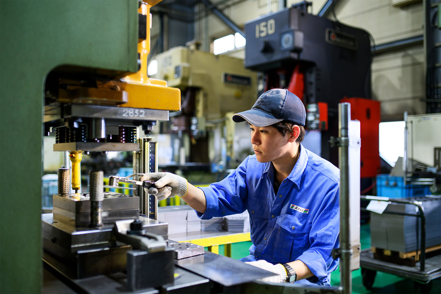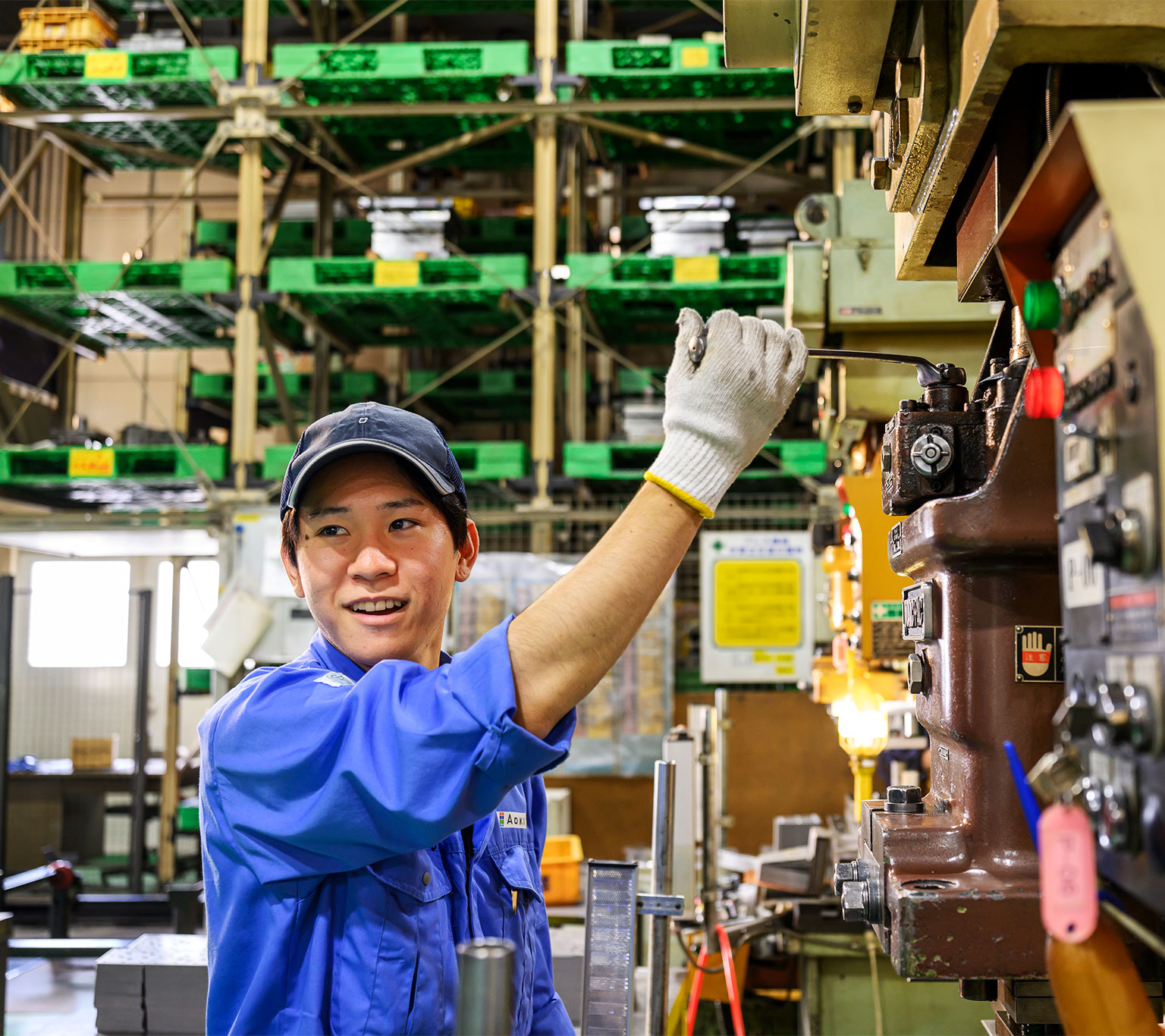 また、1枚の金属板がさまざまな形に変化し、製品として完成する過程にこの仕事の面白さがあります。仕事ではいろいろな機械を操作できるので、ものづくりに興味がある人にとっては楽しい職場だと思います。